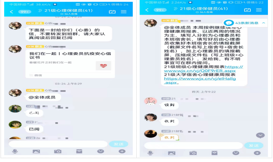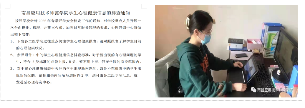 我校以确保学生心理安全稳定为目标,将学生心理健康教育纳入到疫情防控整体工作中,准确把握学生心理动向,及早开展心理危机预防与干预。一是不断完善危机预防干预体系。学校构建了“学校—学院—班级—寝室”四级心理健康教育工作网络。在每个班级配备学生心理委员,每个寝室配备学生心理信息员,开展疫情防控心理健康知识宣传,并发布了《心理委员抗疫安心倡议书》,号召全体心理委员行动起来,积极主动了解疫情期间学生的心理健康状况,及时发现学生存在的心理问题,并在我校所开通的线上“心理健康周报表”中填报或向辅导员及时报告,总体上形成相对闭合、齐抓共管、四级联动的教育工作体系和局面,使存在心理困扰的学生能够得到及时有效的帮助,增强了学校心理健康教育工作的辐射广度与强度。