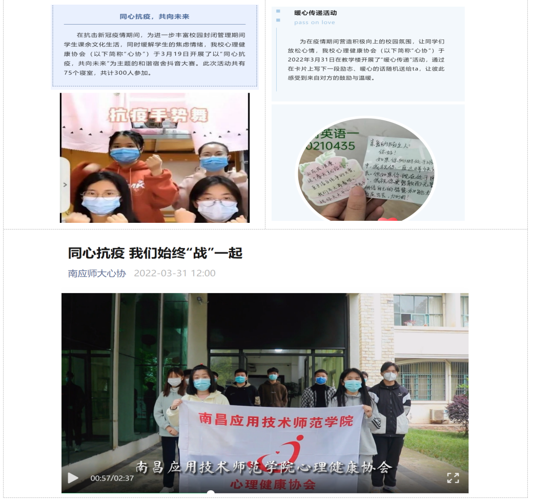 我校开展了“同心抗疫,共向未来”和谐宿舍抖音大赛活动、话语“暖心传递”等系列活动,同时以“5·25”为契机,开展了大学生心理健康教育宣传月主题系列活动,包括拍摄“心理微电影”“心理情景剧”等内容丰富、形式多样的心理健康教育活动。覆盖全校各年级,参与人数达近千人。为助力心理抗疫,我校心理健康协会成员拍摄了关于同“心”抗疫加油宣传视频。