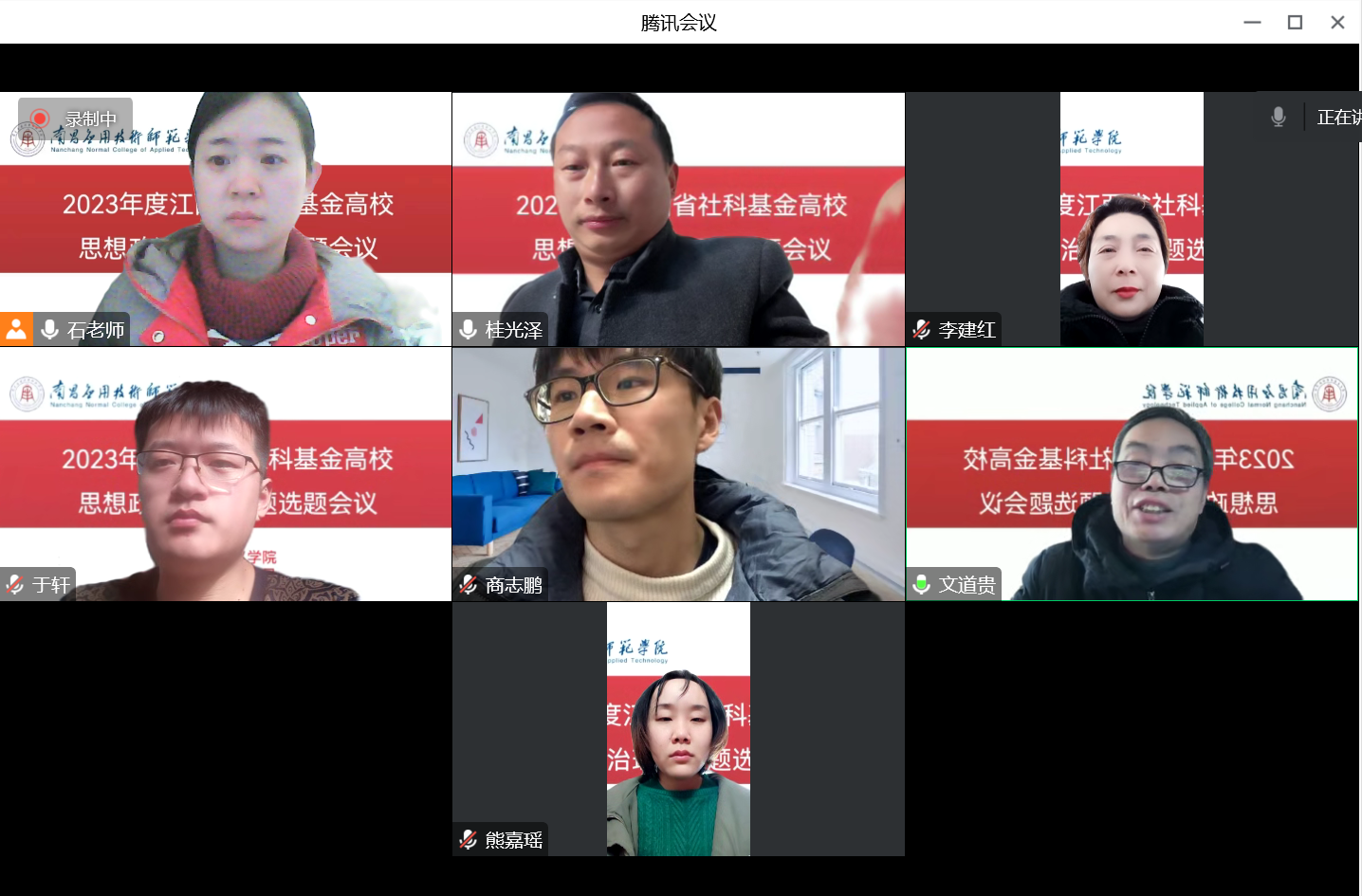 2023年1月20日,必赢76net线路官网召开课题申报线上会议,我院按照课题申报通知及学校党委指示,认真学习和研究江西省社会科学界联合会、江西省教育厅《关于组织开展2022年度江西省社科基金高校思想政治理论研究专项申报工作的通知》,积极组织我院思政专职教师参加专项申报工作。会议由党总支副书记桂光泽主持,院长文道贵、思政教研室6位申报课题的专职教师参会。