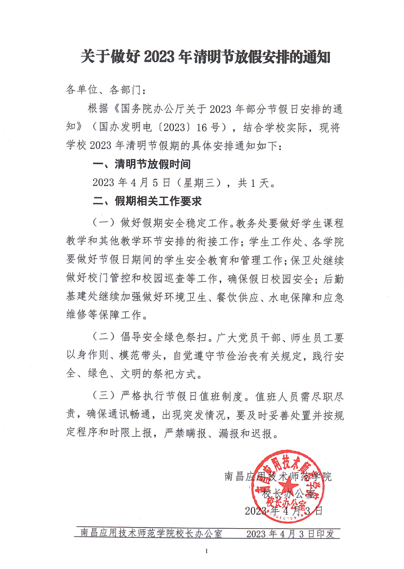 教学管理 学院新闻 学院公告 学院相册 您现在的位置是:首页 > 教学管理 > 学院公告 关于做好 2023 年清明节放假安排的通知 管理员2023-04-041317 上一篇 关于将朱子健等13位同志进行入党积极分子备案的报告