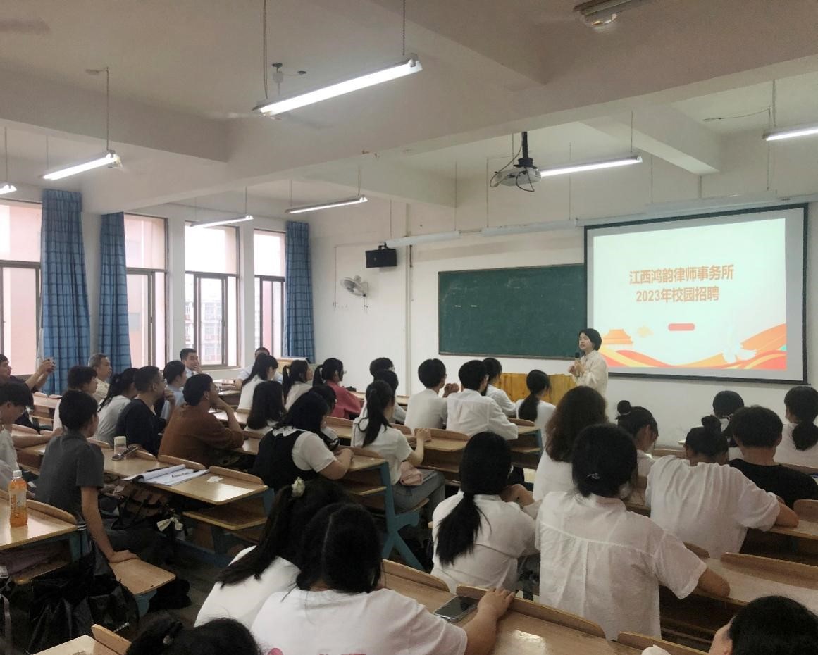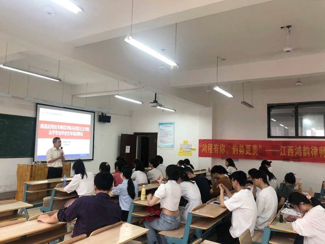 就业是民生之本,是经济发展的基石。为促进我院毕业生更好就业,2023年5月17日下午4点半,学院在教学楼3307教室,组织了法学专业毕业生专场招聘会,招聘方为江西鸿韵律师事务所。