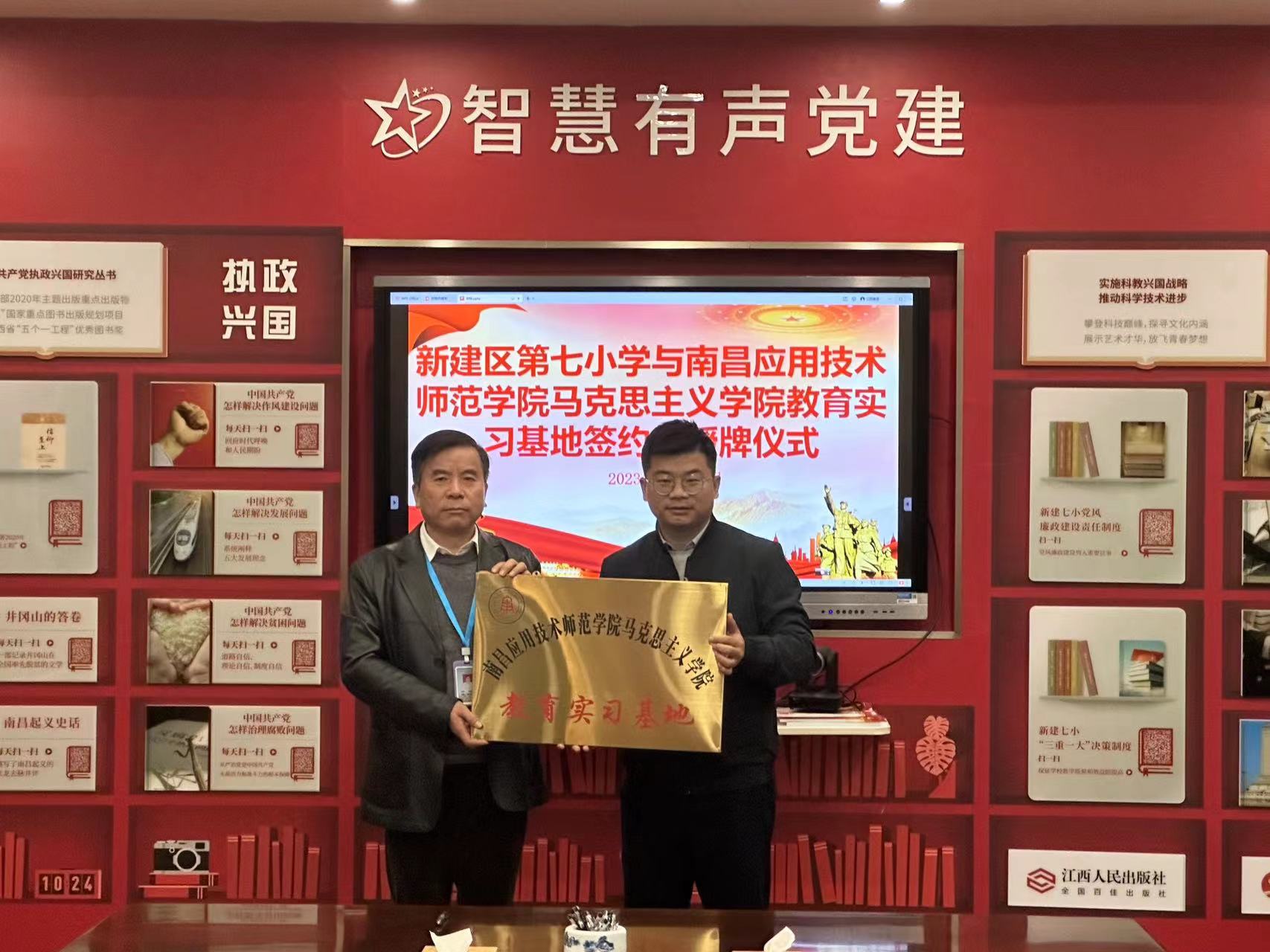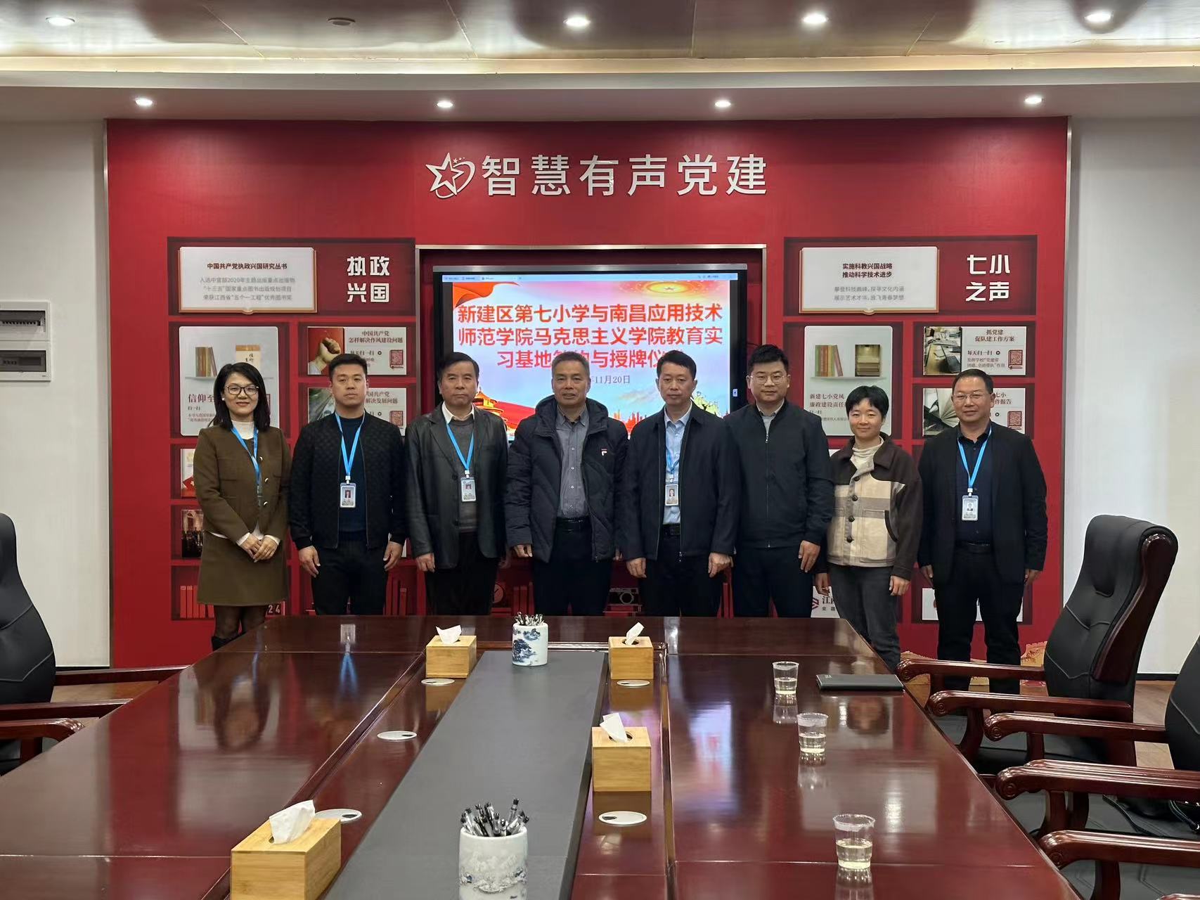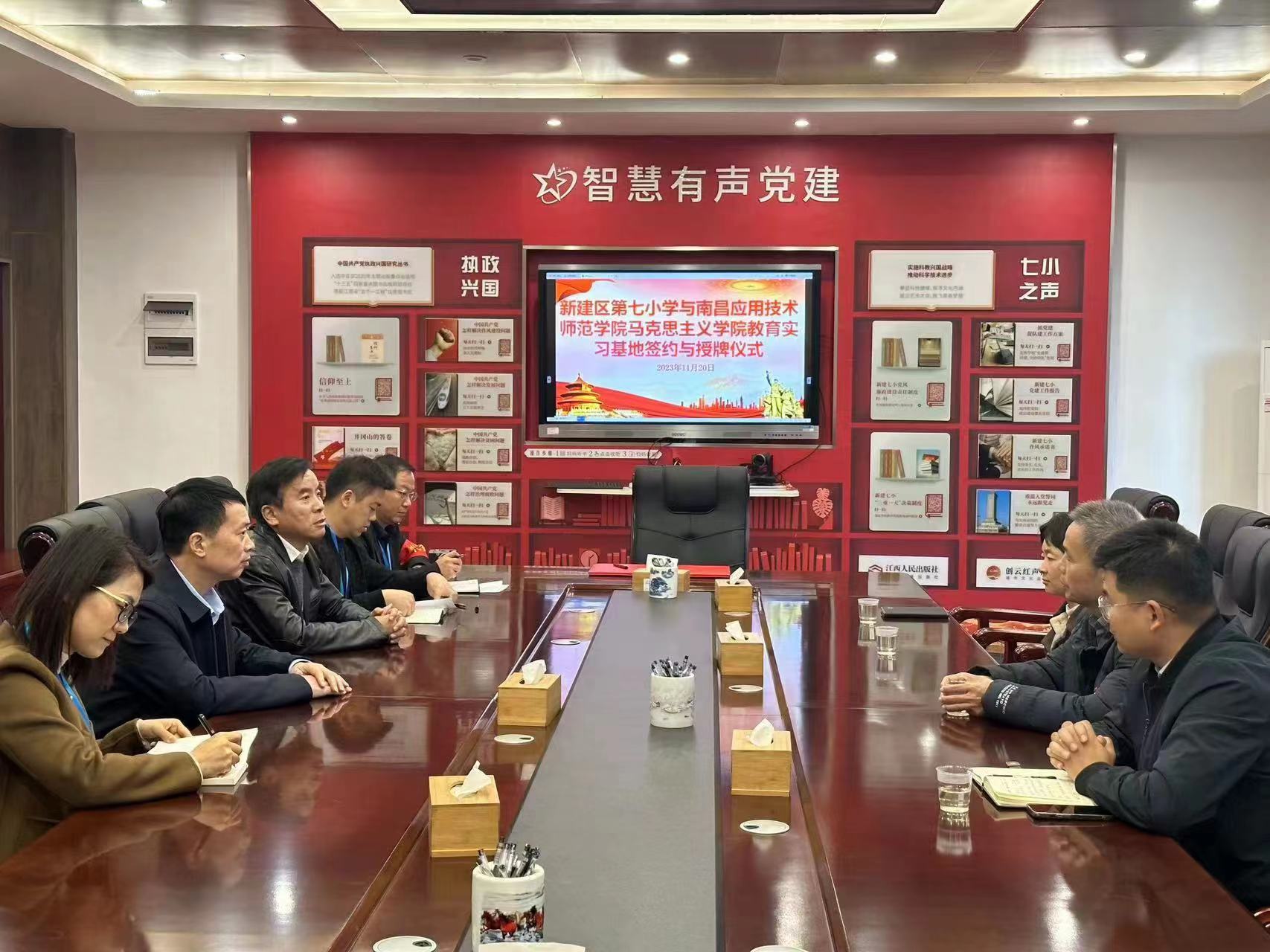 院长文道贵介绍了学院的基本情况及办学特色,并指出实习实训是学生接触社会工作实际,锻炼实践能力的重要手段,也是应用型本科高校培养高素质人才的重要实践教学环节。他表示,与新建区第七小学建立教育实习基地有助于思想政治教育专业学生明确发展方向,希望未来双方互相交流学习,在多个方面开展深入合作,真正发挥教育实习基地的育人作用。