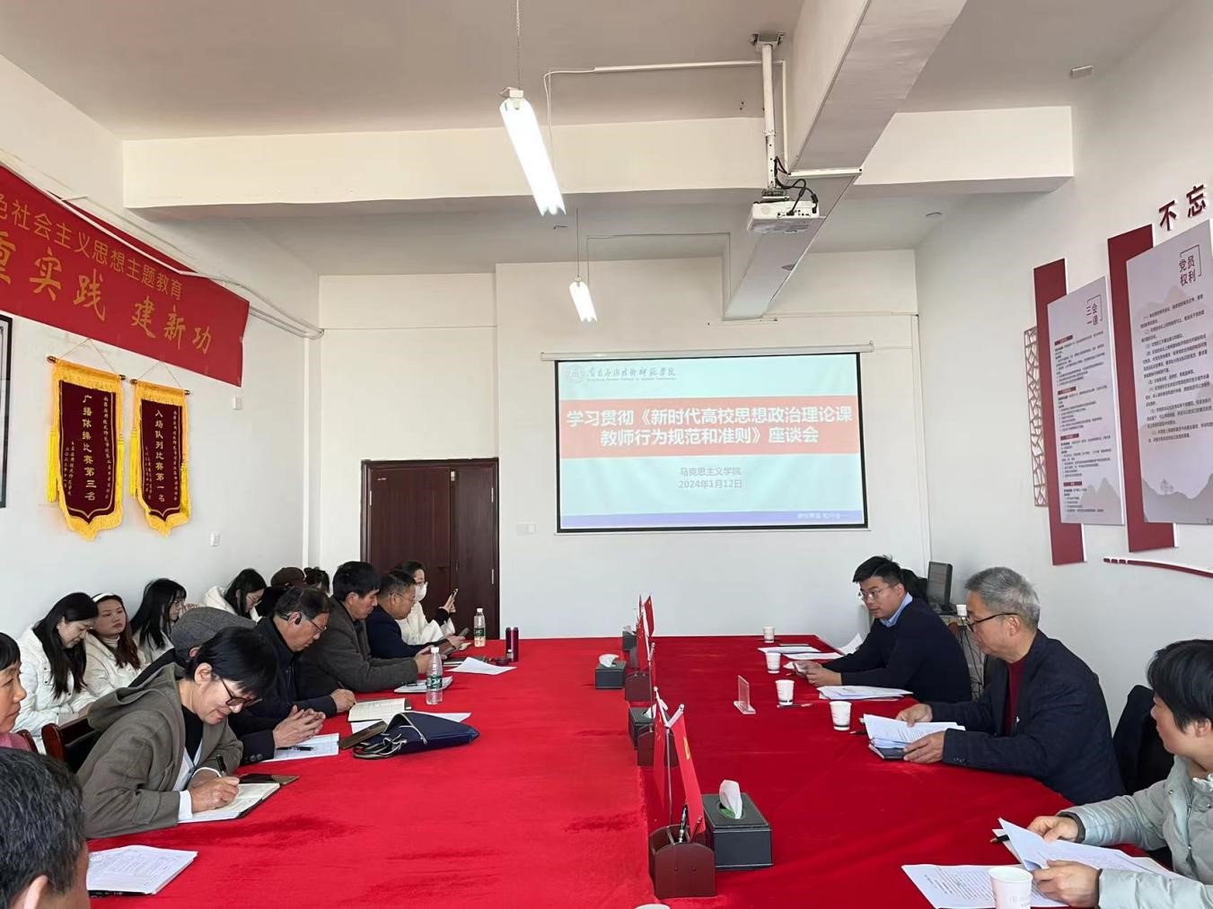 2024年1月12日,76net线路检测举办学习《新时代高校思想政治理论课教师行为规范和准则》座谈会。院长文道贵主持会议,学院领导班子、全体教职工参加。