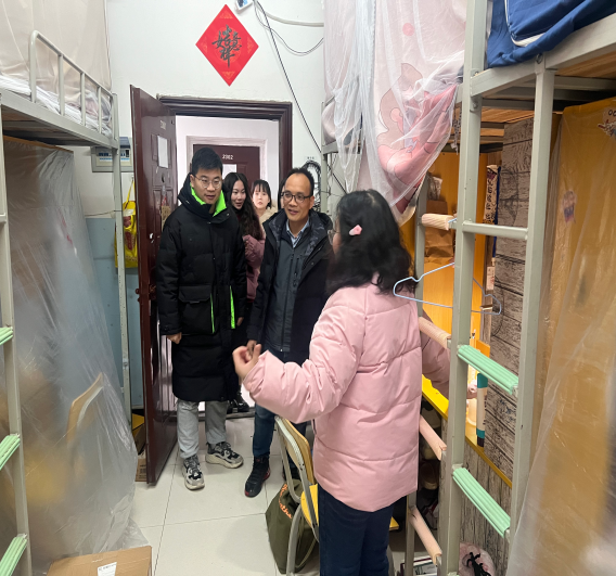 慰问过程中,首先张欣康向蓝贤发介绍了马院学生返校情况以及我院为学生安全返校所做的系列工作。蓝贤发亲切的询问了学生们到校后的感受并叮嘱学生注意各项安全事宜,注意防寒保暖,又详细询问了学生们在校园生活中的困难和需求,并对学生们提出的问题给予了解答。他勉励同学们要珍惜大学时光,努力学习,全面提升自己的能力水平。蓝贤发一行每到一处,都与同学们亲切交谈,了解他们的学习、生活和思想状况,为他们送上节日的祝福和问候。