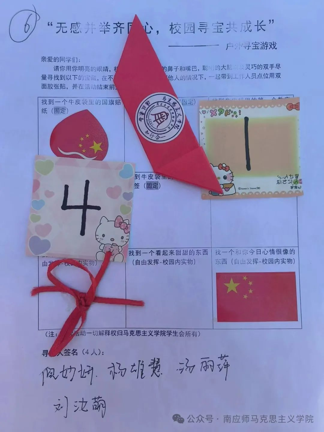 通过本次活动,提高了同学们的团队协作精神和探索未知的热情,同时对新到来的校园环境更加熟悉,让同学们能做一个对身边的事物都能用五感感知的自己。