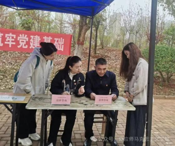 (图为法学教师在法制宣传周活动为学生解疑)