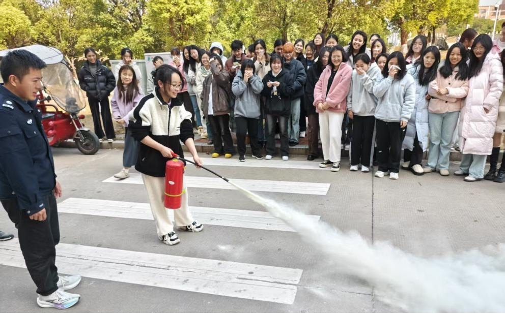 疏散演练结束后,校保卫处消防专员现场开展技能培训。通过对比演示灭火器的适用场景,强调“对症灭火”的重要性;参演师生分批进行灭火器实操,掌握“提、拔、握、压”操作要领及“上风口站位、对准火焰根部扫射”技巧。此外,演练前学院已通过专题宣讲、防烟面罩使用教学等环节,强化“预防为主,防消结合”的消防理念。