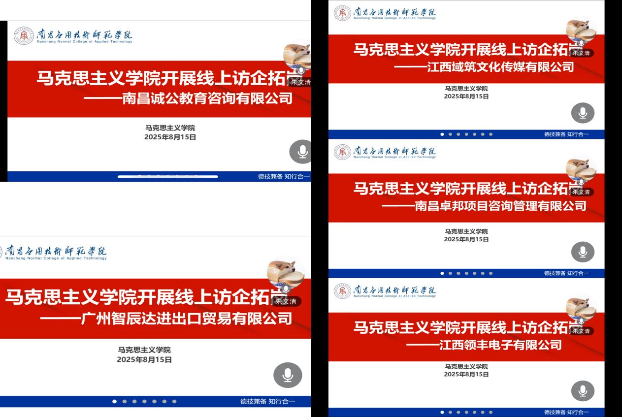 为拓宽毕业生就业渠道,强化校企合作,给学生提供更广阔的职业发展空间,8月15日,76net线路检测党总支书记张欣康通过视频形式对南昌诚公教育咨询有限公司、广州智辰达进出口贸易有限公司、江西域筑文化传媒有限公司、南昌卓邦项目咨询管理有限公司、江西领丰电子有限公司进行访问,双方就人才培养、实习实训、就业指导等方面进行了深入交流,并达成了一系列合作意向。