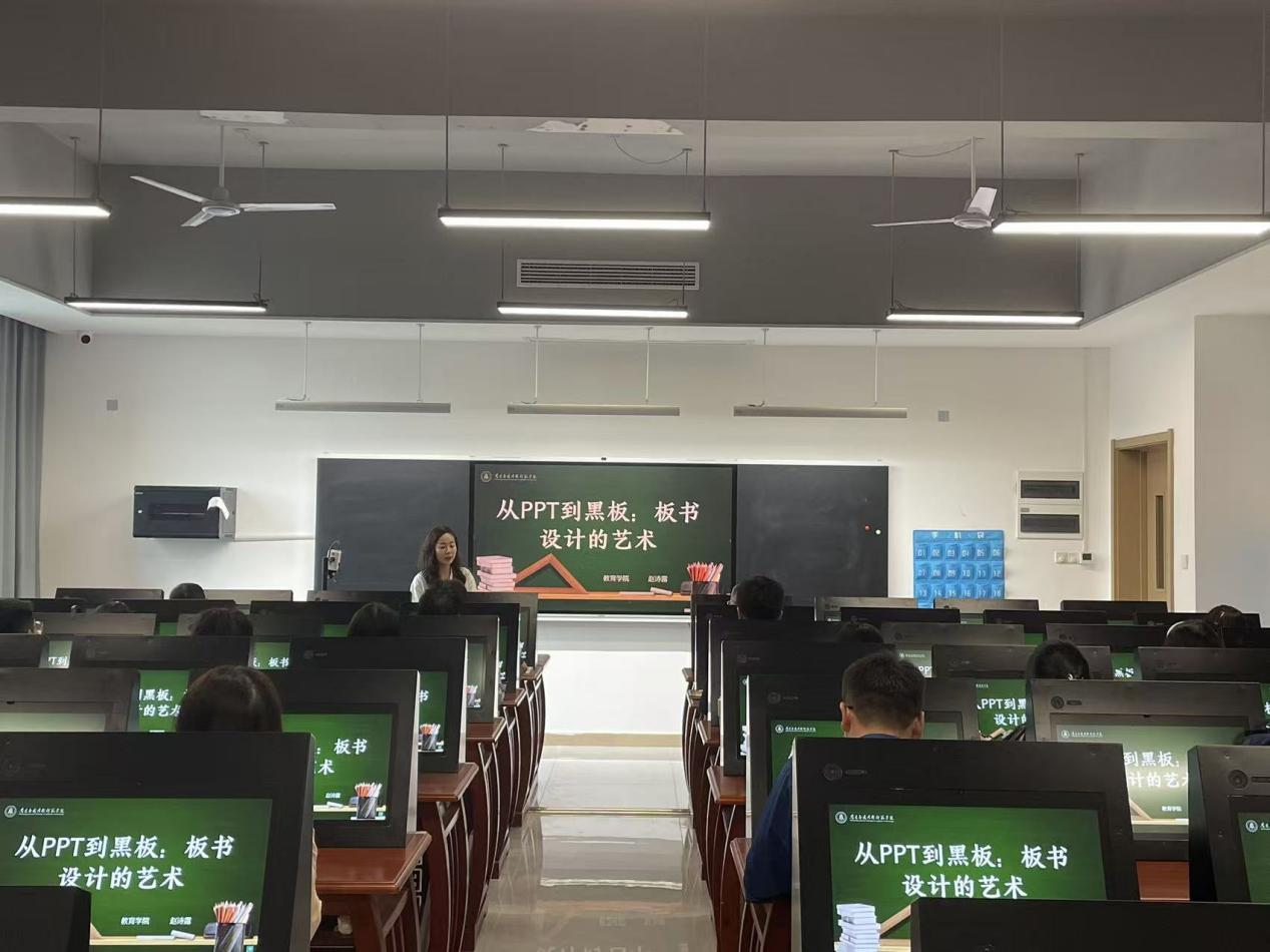为进一步夯实教师教学基本功,推动课堂教学质量持续优化,9 月 30 日下午,教育学院赵诗露老师在沁苑十实 408 教室为全院教师带来一场主题为 “从 PPT 到黑板:板书设计的艺术”的课堂教学板书技能经验交流会。76net线路检测副院长刘德彰、院长助理杨志明以及全体专任教师参会,会议由学院教务科负责人李文静主持。